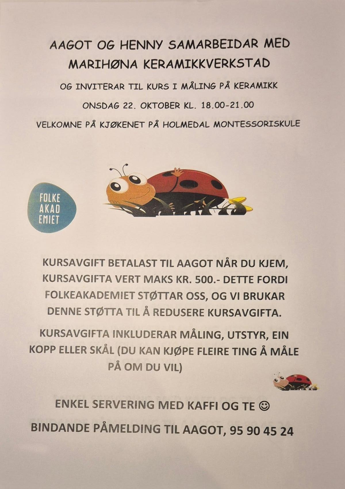 Hei. Har du lyst å vere med å måle på keramikk ? Onsdag 22. Okt kjem Marihønaverkstad, og det blir målekveld på Holmedal Montesorriskule kl 18.00 - 21.00